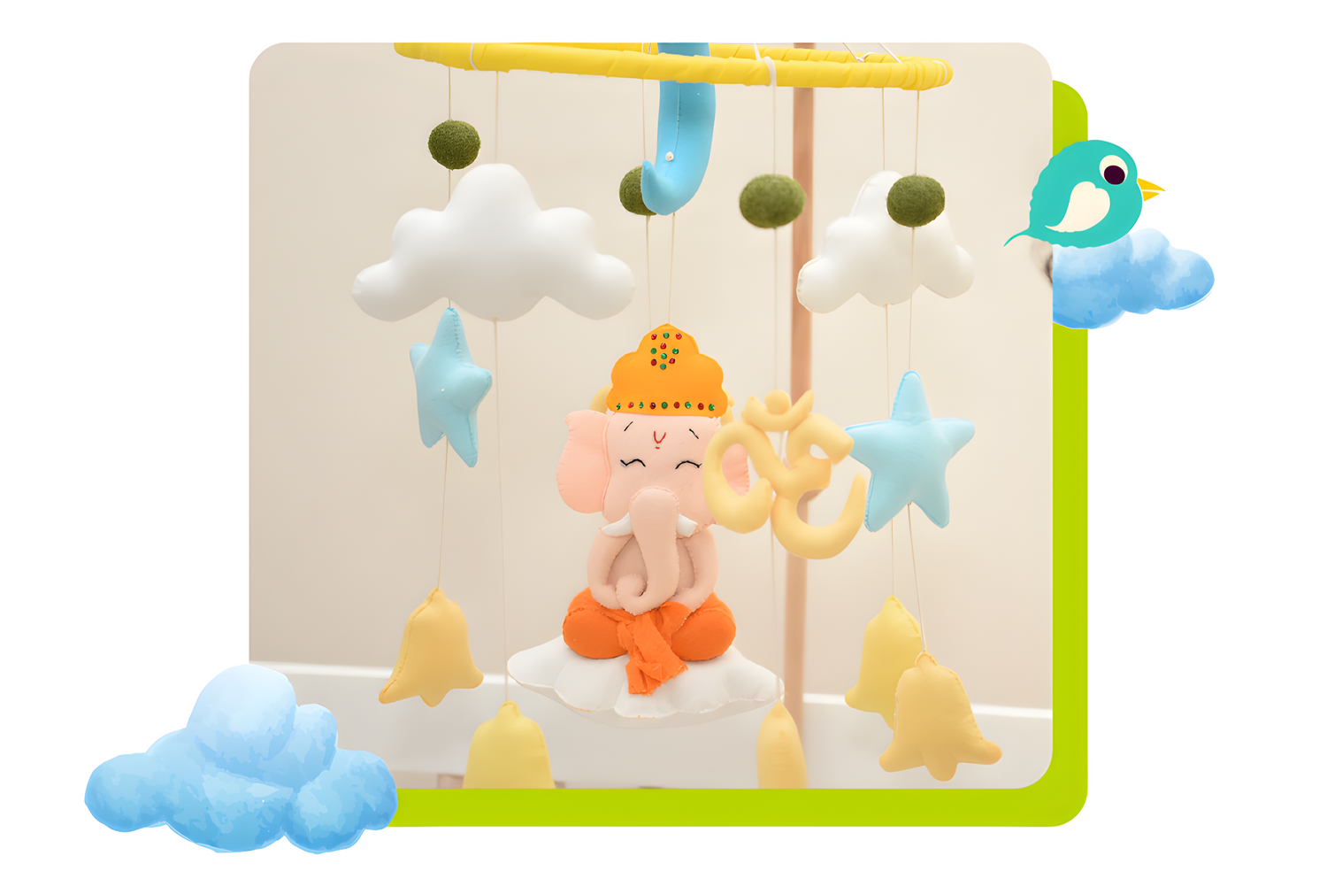A beautifully crafted crib mobile featuring Lord Ganesha, bringing blessings, wisdom and protection to your little one.