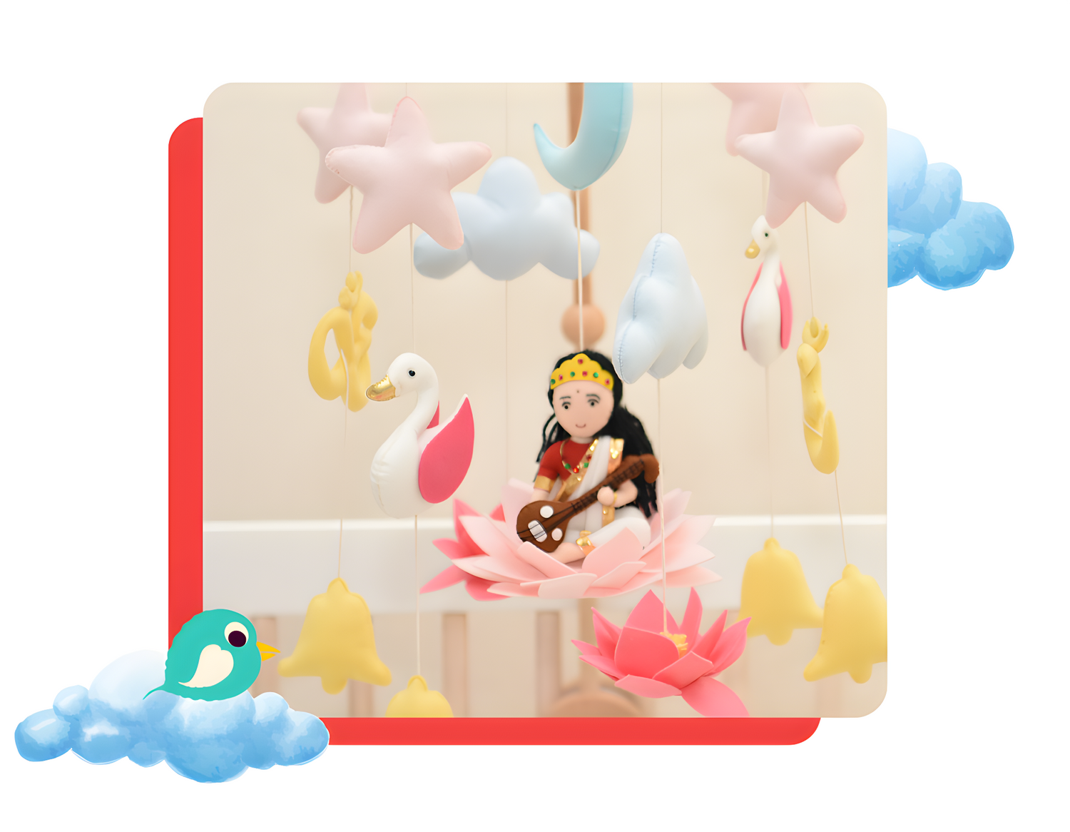 Inspired by Goddess Saraswati, the deity of wisdom and learning, this crib mobile is designed to inspire creativity, knowledge, and enlightenment in young minds.