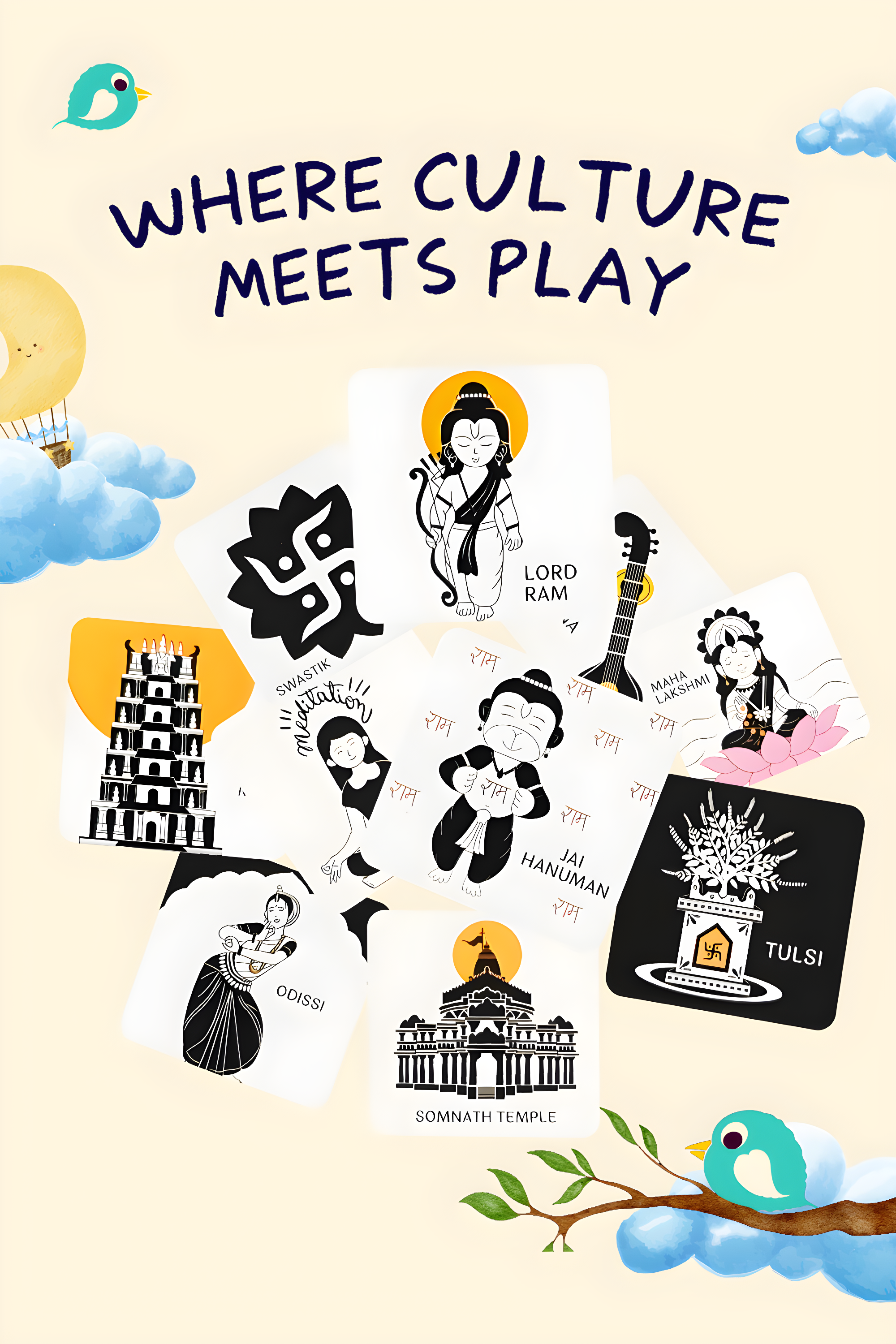 A unique set of cards featuring shlokas (sacred chants) with phonetic pronunciations and meanings, making it easy for kids to learn and recite ancient verses.